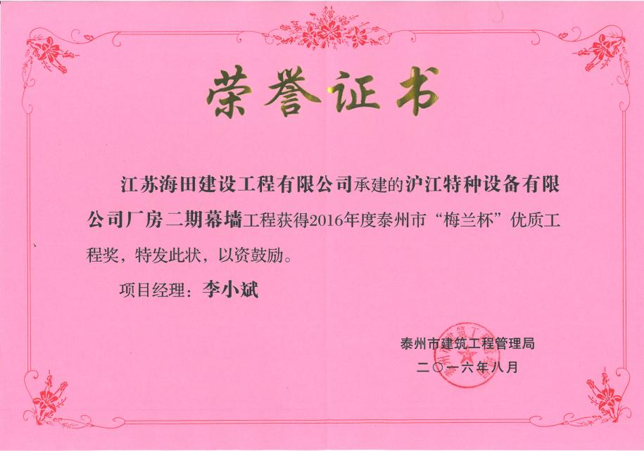 熱烈祝賀我公司承建的滬江特種設備有限公司廠房二期幕墻工程獲得2016年度泰州市“梅蘭杯”優(yōu)質工程獎
